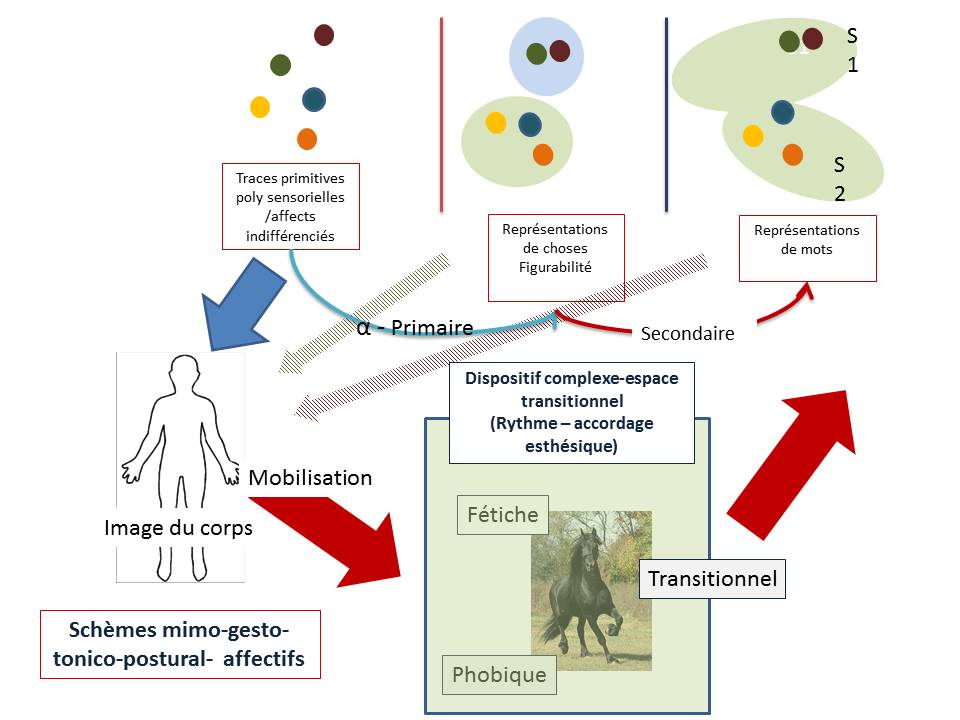 - Intégration des traces brutes en éléments de figures par activation de la fonction alpha (Bion), puis accrochage de ces figures dans le langage: la fonction symbolisante, qui va permettre de les métaboliser en éléments de pensées )qui vont constituer les bases d’un réseau associatif ouvert susceptible d’être travaillés par un sujet devenu autonome.