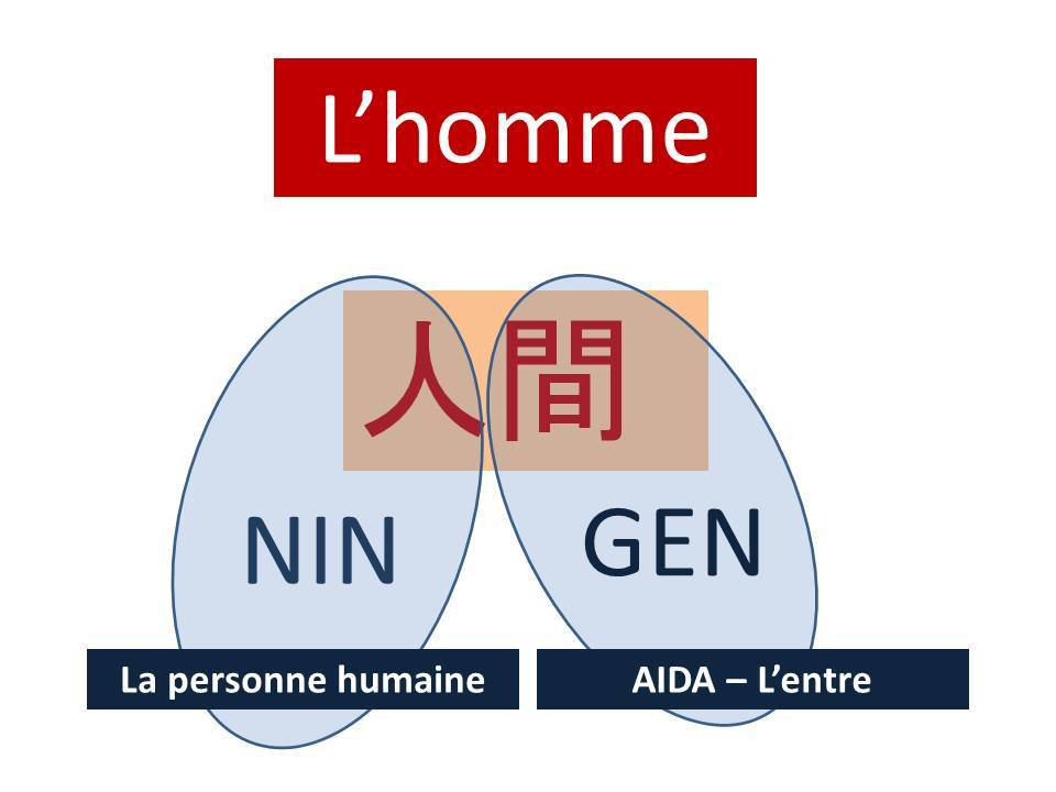 On voit qu’il est constitué en fait de deux idéogrammes le premier – Nin – signifie la personne humaine dans sa dimension générique – la seconde – Gen ou Aida – veut dire « entre », « écart ».