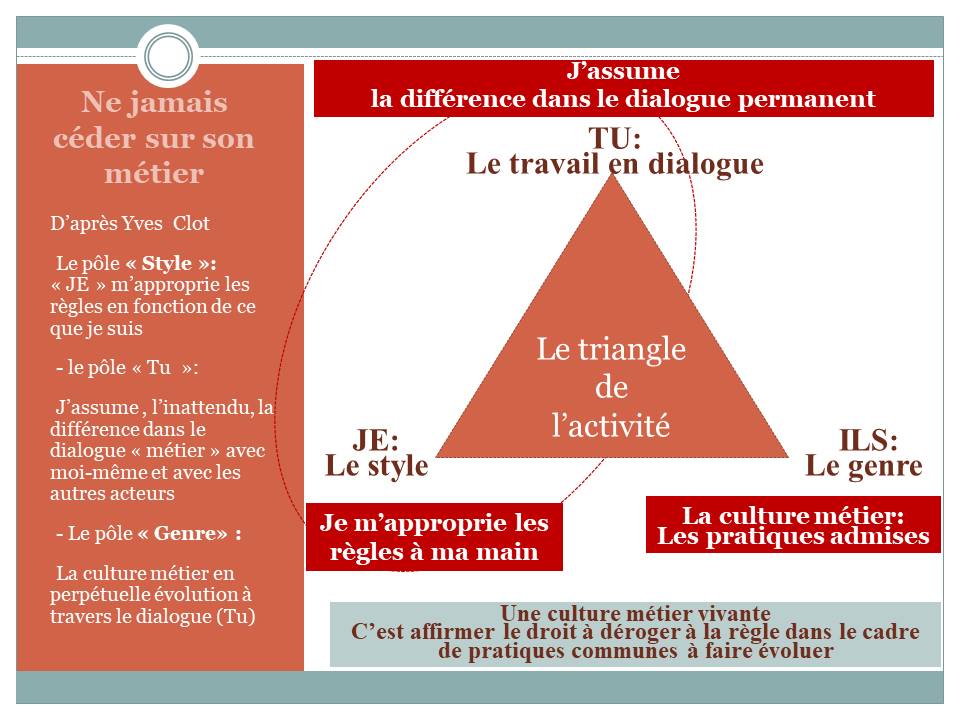 L’hygiène du « désir de travail » (c’est-à-dire la préservation d’un possible plaisir au travail) consiste, alors, à s’assurer d’une élaboration continue de la culture métier, dimension instituante, par une mise en dialogue permanente entre pairs afin de se prémunir du danger mortifère de la répétition à l’identique qui introduit un nouveau niveau de rigidité (l’institué) dans un corpus qui doit rester vivant.