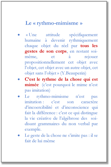 L’apprentissage se fait par « mimisme » (diffèrent de mimétisme). Le jeune enfant imite ce qu’il perçoit de l’interaction avec les « choses » qui se dépose comme schèmes Sensori-Affectivo-Moteurs (SAM) impliquant tous les sens et tout le corps. Ce qu’il reproduit à l’intérieur de lui est le rythme de la chose perçue revue par les expériences déjà déposées