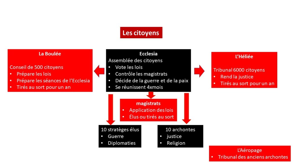 - L’assemblée qui rassemble tous les citoyens. Elle vote les lois à main levée avec majorité simple